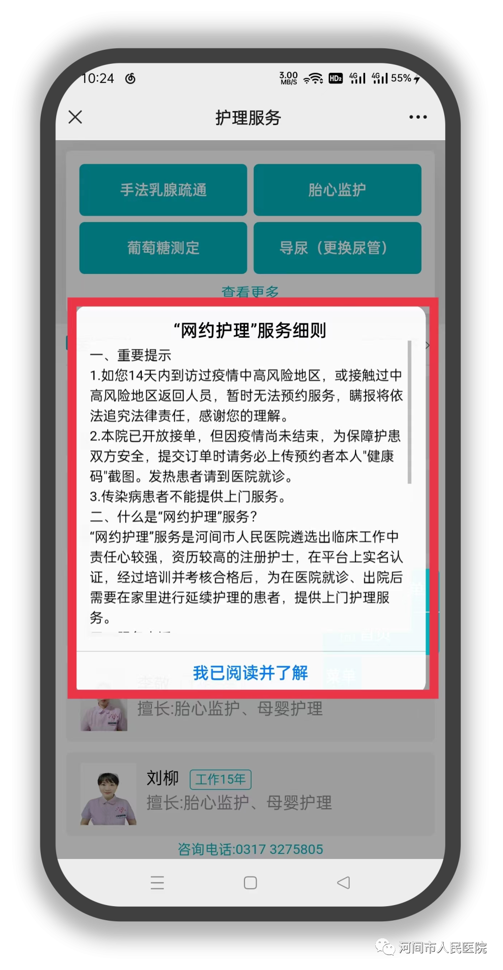 3.选择【就诊卡】,认真查看“网约护理”服务细则,点击【我已阅读并了解】;