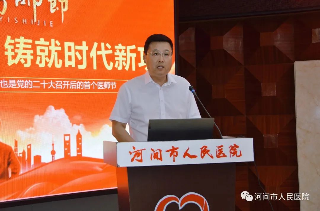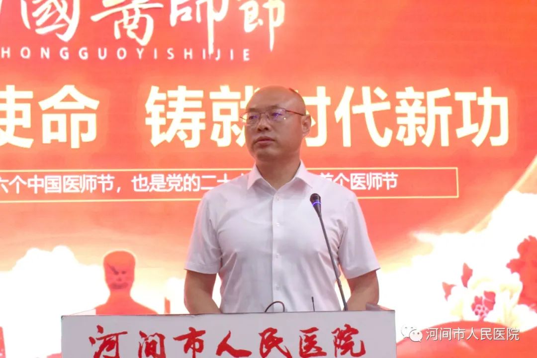 随后,院党委书记李记涛代表医院领导班子全体成员向兢兢业业、无私奉献、为守护人民群众生命健康终日奋斗的医师们致以诚挚的节日问候!向全院评选出的优秀医师表示真诚的祝贺!向长期以来,默默支持医院工作的医师家属们表示衷心的感谢!他表示,今天是第六个中国医师节,全院医务工作者坚持以党建为引领,高举习近平新时代中国特色社会主义伟大旗帜,不断强信念、践使命、跟党走,将思想的凝聚力转化为生产生活的强大动力,推动医院高质量发展。