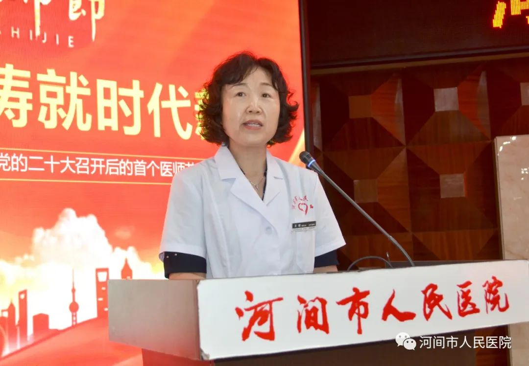 优秀医师代表风湿免疫科王靖主任上台发言,她结合自身岗位及从业感受作了真挚精彩的发言,展现了立足本职、甘于奉献、善于学习、勇于创新的医者形象,彰显了医者的责任和担当!