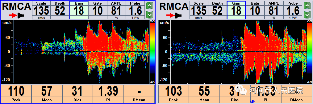 异常时心脏超声左心内出现微泡,TCD检测大脑中动脉发现微栓子信号。