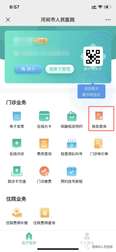 如果是实体卡就医的,关注押大小软件下载 公众号,进入个人中心进行就诊卡绑定后,就能查看电子报告和下载PDF版报告了(与上方操作一致)。